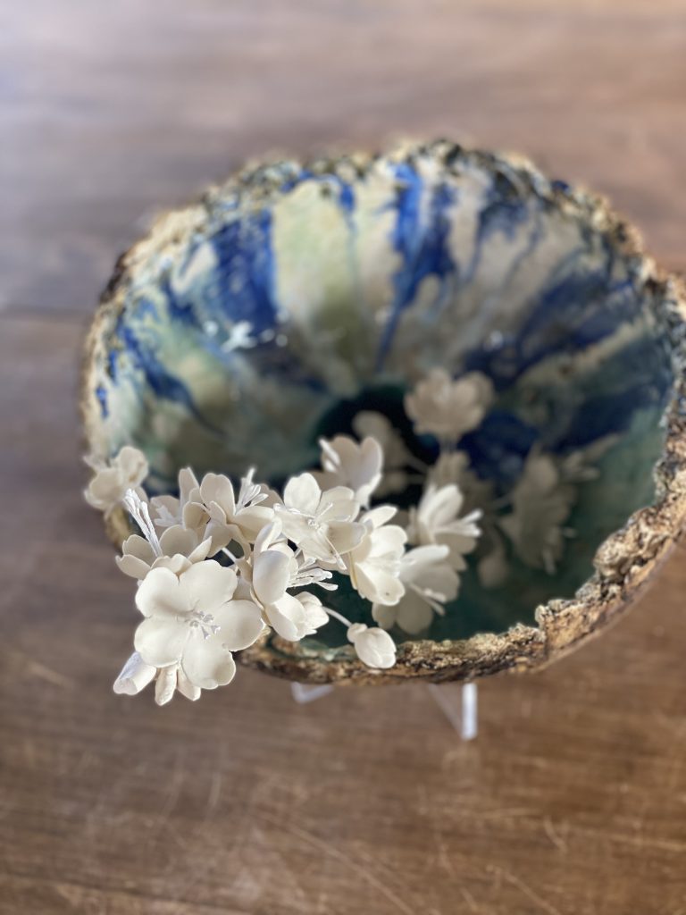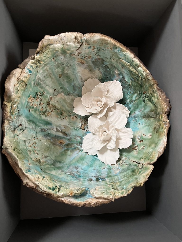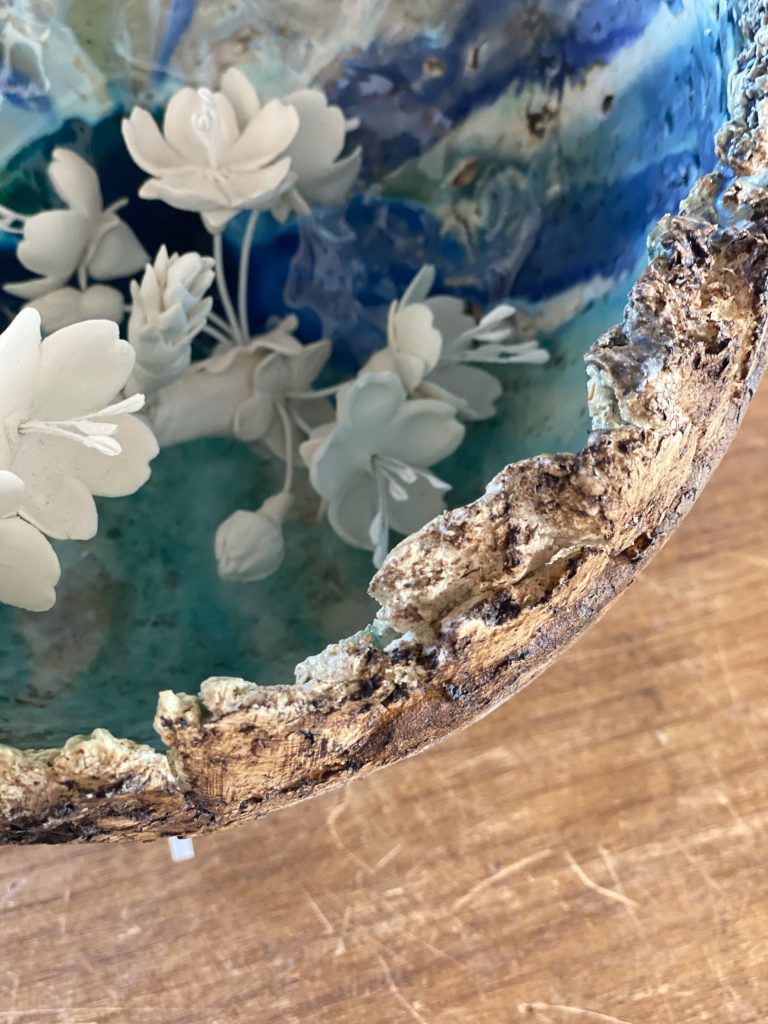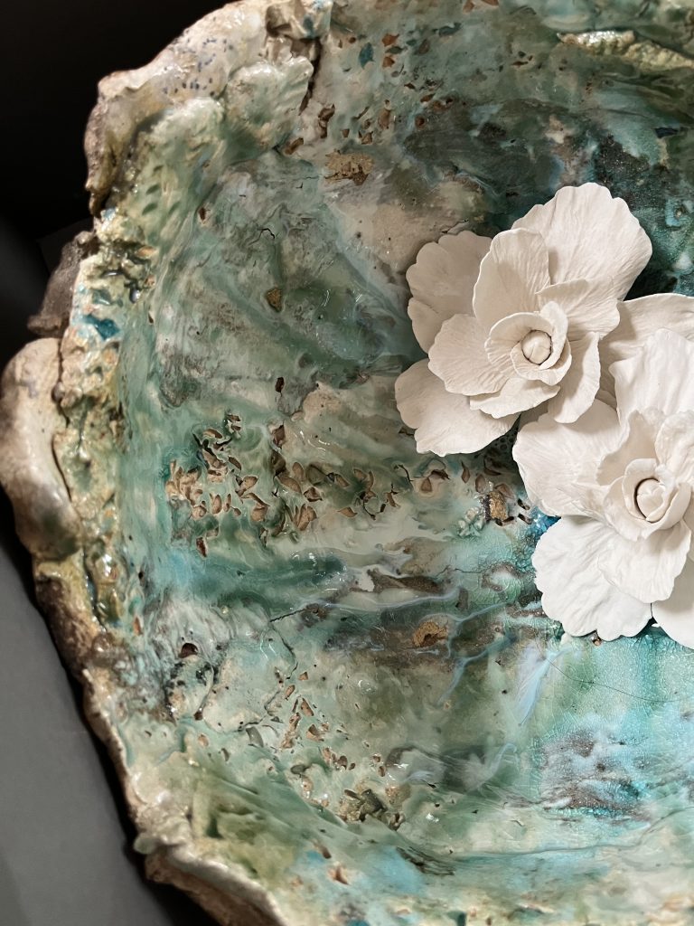 imagen de semiesfera verde con flores ensalzando el detalle de las flores de cerámica